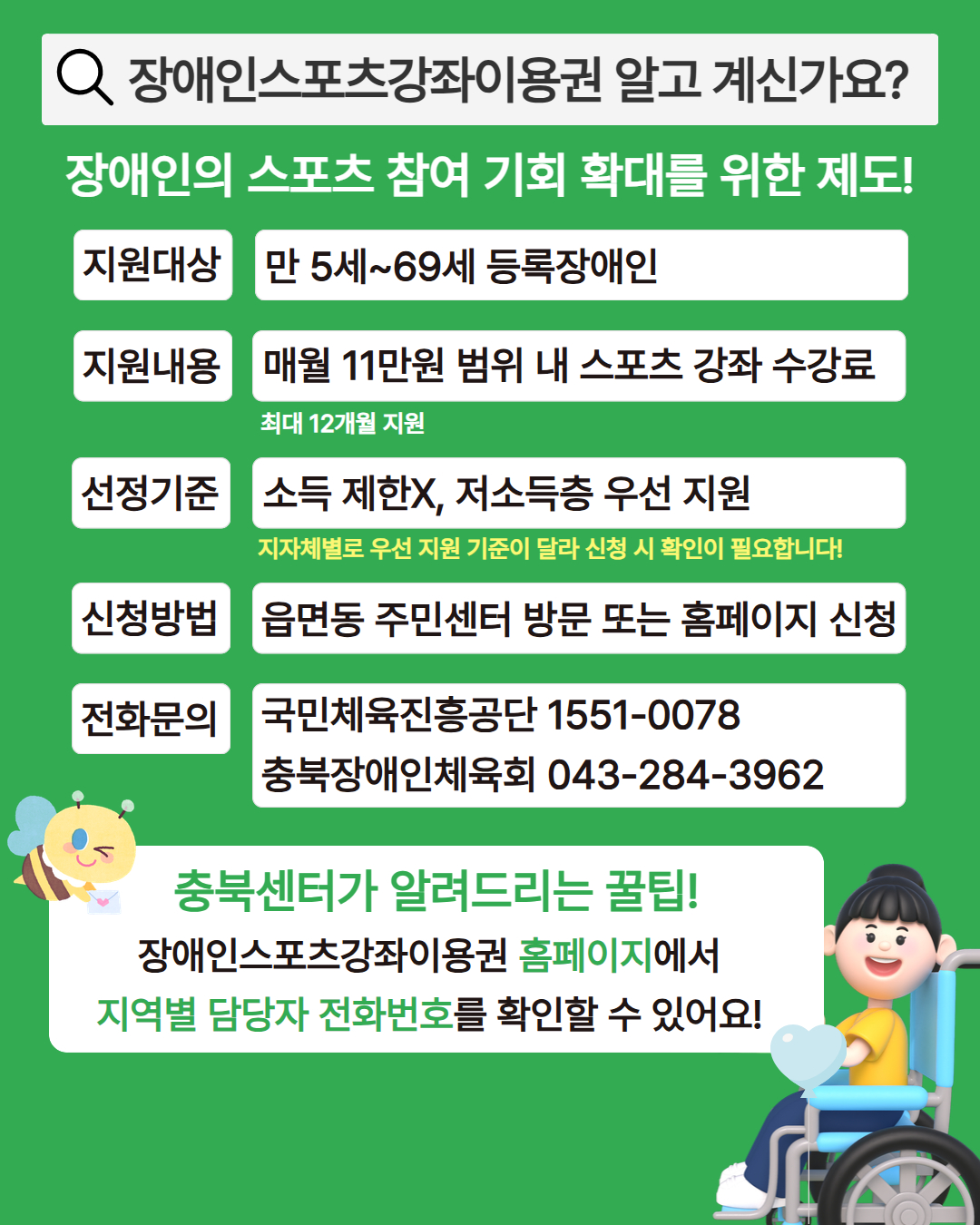- 장애인 스포츠강좌이용권 지원사업 홈페이지 또는 주민센터에서 신청!