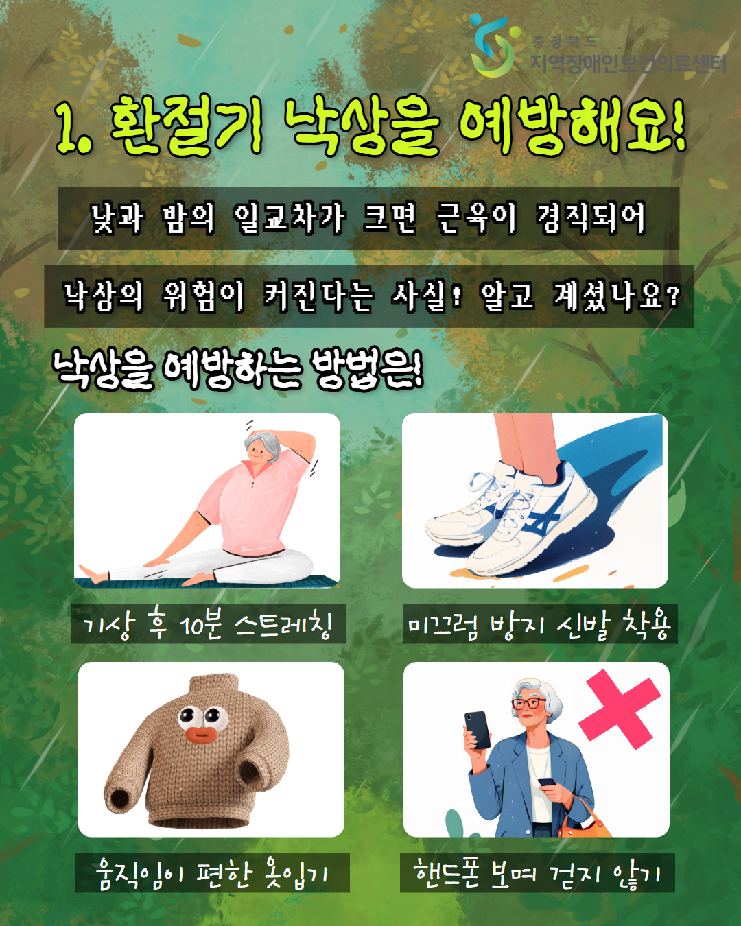 안녕하세요! 충북지역장애인보건의료센터입니다. 갑자기 추워진 날씨에 겉옷을 꺼내 입게 되는 요즘! 환절기의 건강한 일상을 위한 낙상 예방법, 에너지 바우처 안내 그리고 센터 활동 소식을 준비했어요! 함께 살펴볼까요?