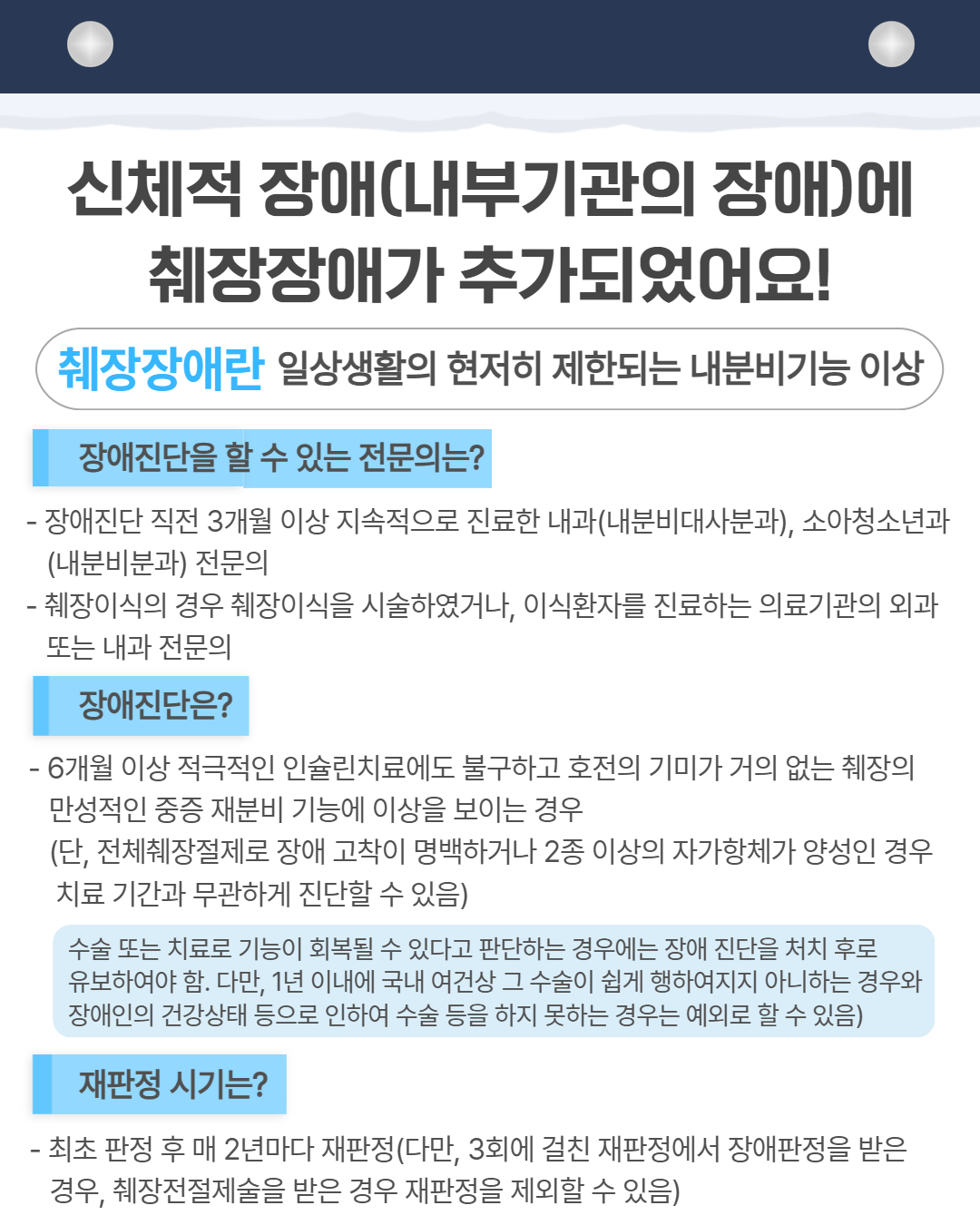 - 수술/치료로 회복 가능 시 → 처치 후로 진단 유보 - 최초 판정 후 2년마다 재판정(단, 3회 모두 장애 판정 시 재판정 면제 가능, 췌장전절제술 받은 경우 재판정 제외)
