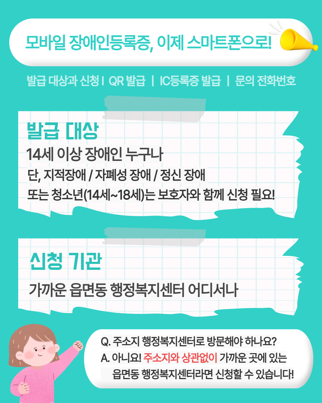 1. 발급대상: 14세 이상 장애인이라면 누구나(지적장애, 자폐성 장애, 정신장애 또는 14세~18세의 청소년은 보호자와 함께 신청 필요)