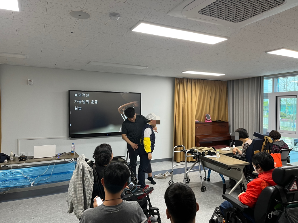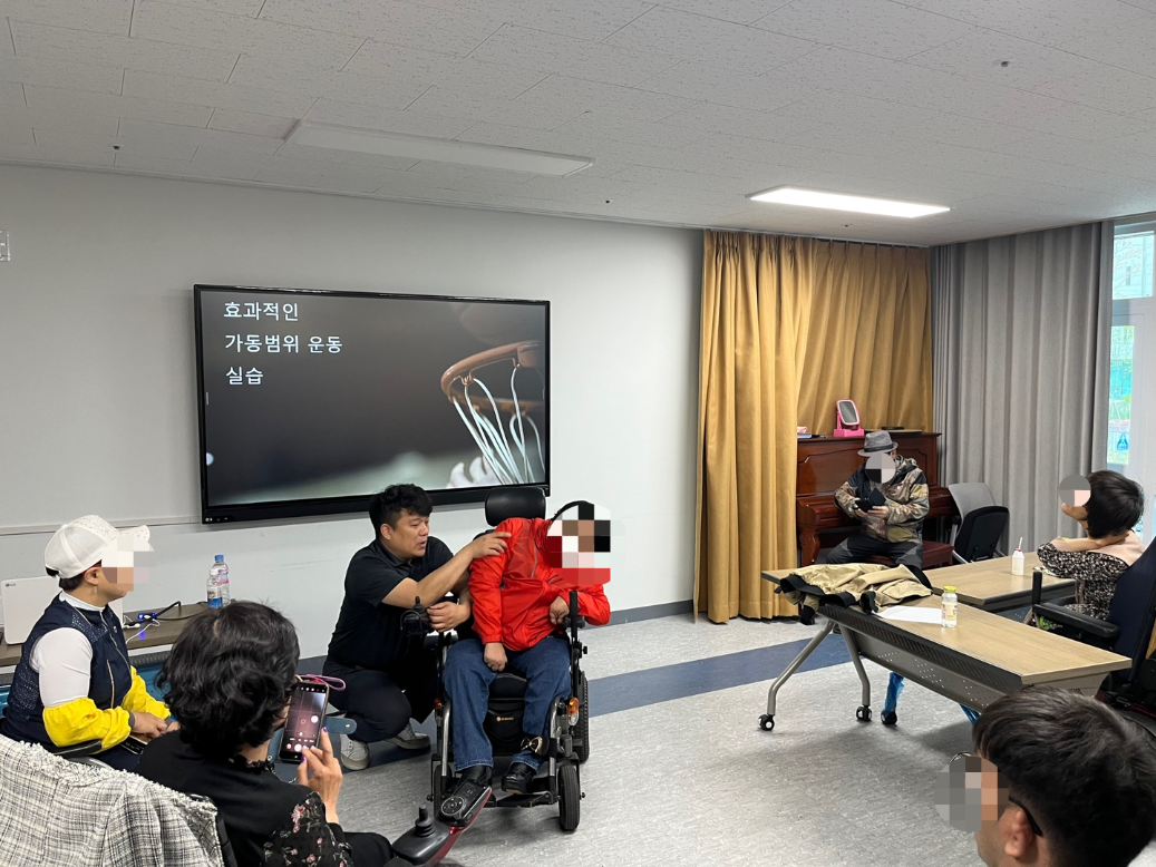 첫번째 시간으로 활동지원사 분들과 함께 재가에서 가능한 운동방법과 안전한 이동방법을