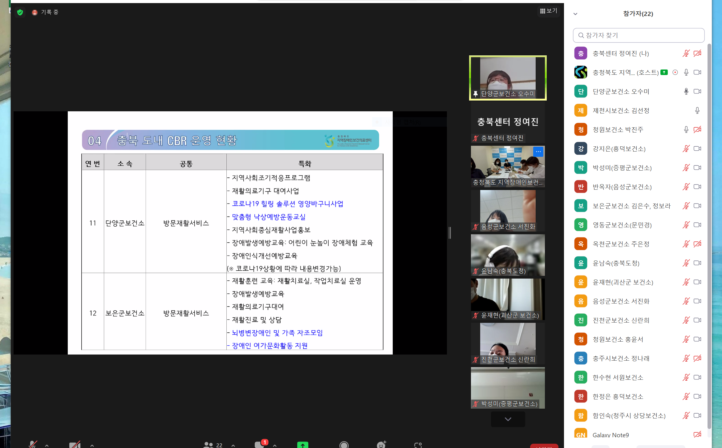 센터 사업 소개와 함께 각 지역 보건소 CBR사업 운영 현황을 공유하였으며 담당자 의견을 수렴하는 시간을 가졌습니다.
