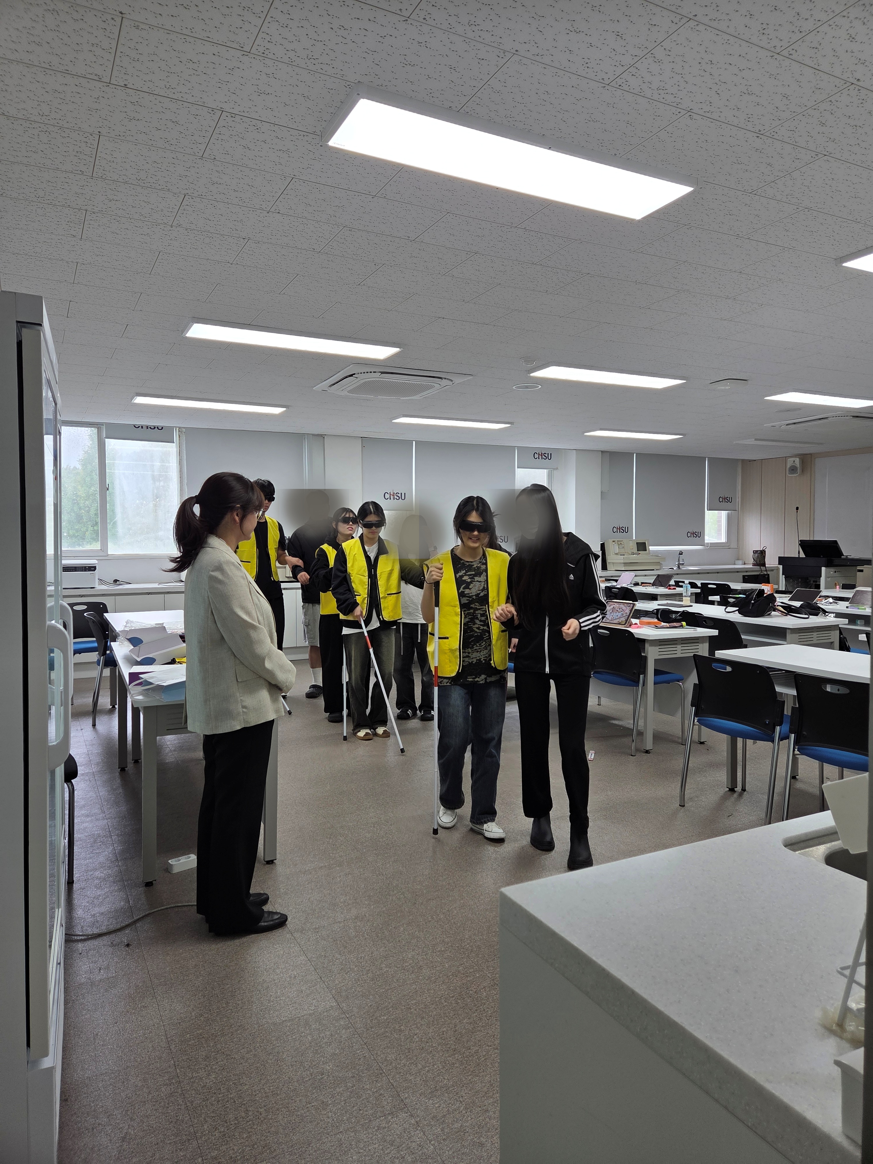 시나리오를 준비하여 실습실에서 직접 장애인 당사자가 되어보기도 하고, 장애인을 응대하는 임상병리사가 되어보는 시간을 갖어 보았습니다.