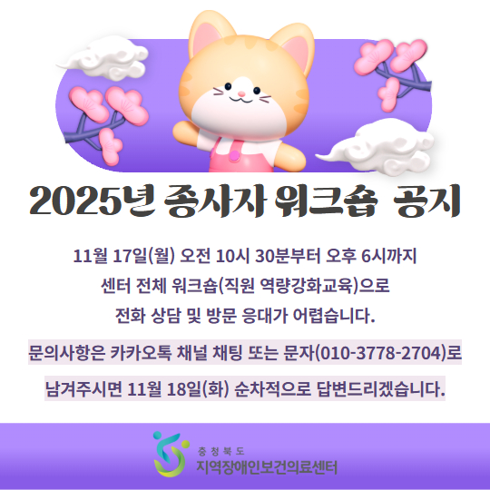 안녕하세요, 충청북도 지역장애인보건의료센터입니다. 11월 17일(월) 오전 10시 30분부터 오후 6시까지 2025년 종사자 내부 교육(사례관리 및 상담 심화) 진행으로 전화 상담 및 방문 응대가 어렵습니다. 문의사항은 카카오톡 채널 1:1 채팅 또는 감사합니다. |