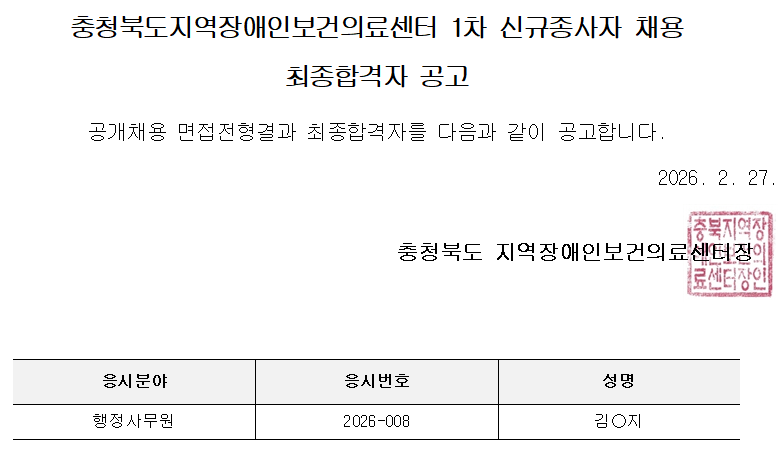 2026년 1차 센터 업무종사자(행정사무원) 최종합격자 공고
